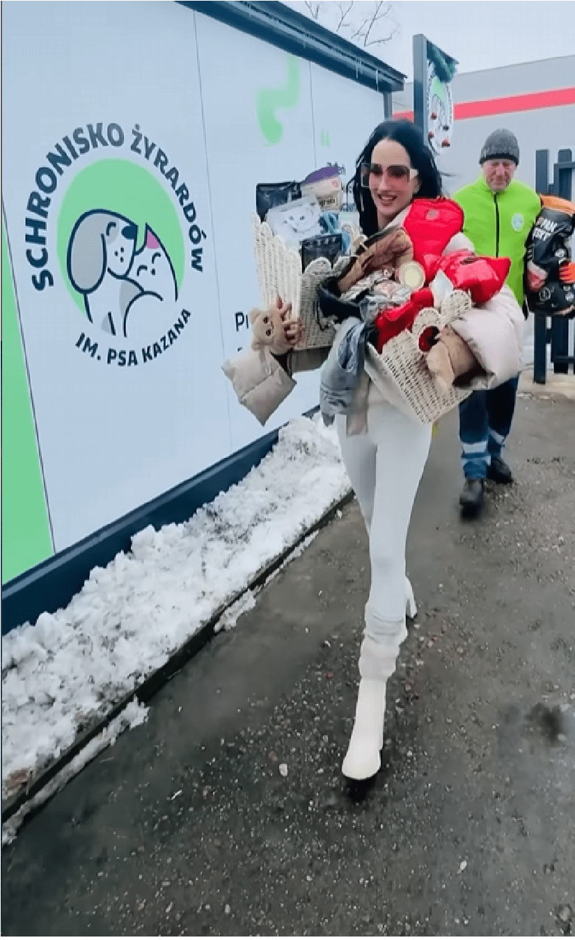Dopiero później artystka udała się do schroniska, gdzie przekazała karmę oraz ubranka dla psów i kotów. Całość relacjonowała spokojnie, bez patosu, skupiając się na samych zwierzętach i ich potrzebach.